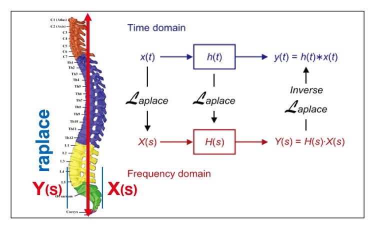 その結果、「周波数領域(frequency)においてY(s)=X(s)」となり、「骨盤補正二段ベルト」の装着はヒト脊椎の湾曲修正を行う事が数学的な側面から実証されました(図A)。